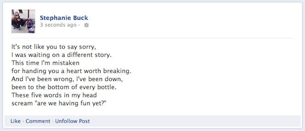 | 3. Suốt ngày đăng lời bài hát: Đôi khi lời bài hát thay điều muốn nói. Nhưng với một tài khoản Facebook một ngày post hàng chục lời bài hát, họ cũng dễ bị tẩy chay bởi không ai muốn trang News feed của mình biến thành một website âm nhạc. |