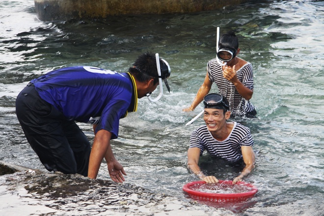 | Ở đảo Đá Thị, hòn đảo chìm nằm ở phía Bắc của quần đảo Trường Sa, ngoài giờ làm nhiệm vụ, các chiến sĩ trẻ được thoải mái lặn mò ốc biển, vừa để cải thiện bữa ăn, vừa để có vỏ ốc đẹp làm quà tặng. |