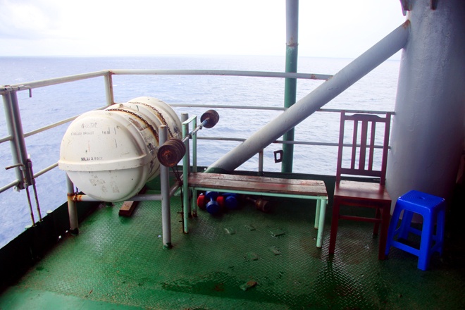 | Ở nơi chật hẹp như trên nhà dàn DK1-11, những chàng lính đảo cũng không quên bố trí một bộ đồ tập tạ gọn nhẹ. |