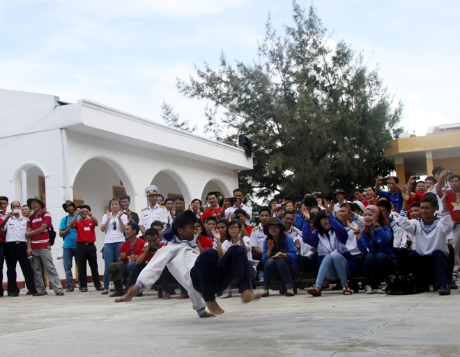 Ngoài giờ tập luyện, chiến sĩ trên đảo cũng không quên tập... hip hop. Trong ảnh là các chiến sĩ đang biểu diễn bài nhảy của mình trước khách đến thăm.