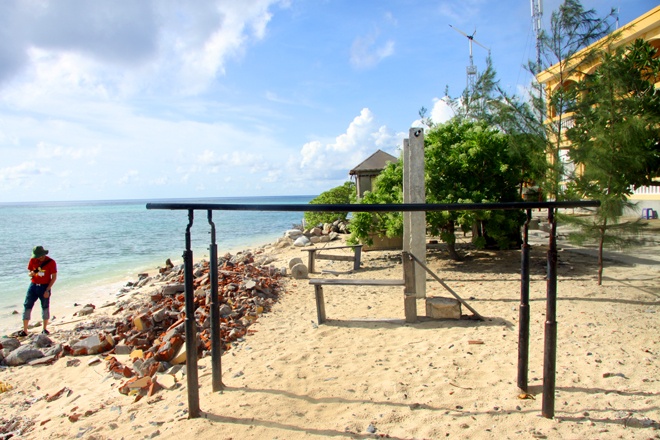 Góc tập tạ khiêm tốn trên đảo Đá Thị.