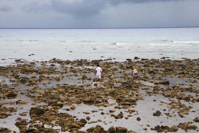 Trường Sa, sau một chiều mưa lớn, những cư dân áo lính trên đảo kéo nhau ra bãi đá nhặt hải sản.