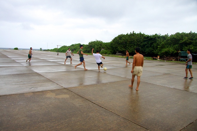 Cũng tại Trường Sa, sân bay trở thành sân đá bóng lý tưởng cho các "cầu thủ" cuối giờ chiều.