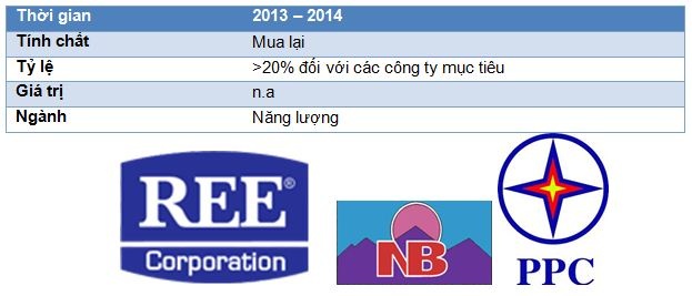 Năm 2013 và đầu năm 2014, REE đã đầu tư để tăng tỷ lệ nắm giữ tại các công ty điện, than, nước như Nhiệt Điện Phả Lại (22,37%), Than Núi Béo (23,62%), Cấp nước Thủ Đức TDW (41,94%), Than Đèo Nai (23,83%)...