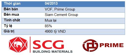Tháng 4/2013, tập đoàn Siam Cement Group (SCG) của Thái Lan đã ký một thỏa thuận mua lại 85% cổ phần của Prime Group với giá 7,2 tỷ baht, tương đương 4,9 ngàn tỷ đồng.