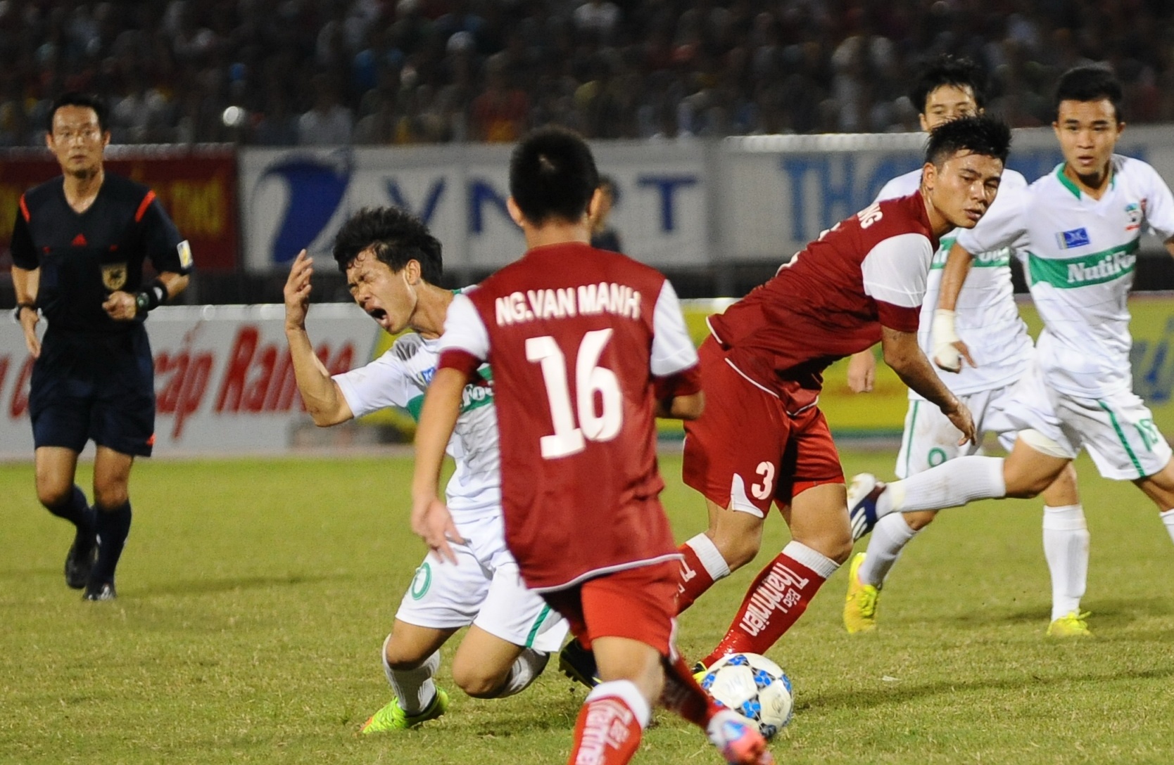 | Đội trưởng Văn Thuận và trung vệ Mạnh Hùng phản ứng trọng tài trong tình huống phạm lỗi với Công Phượng. Hành động chỉ tay thẳng vào Công Phượng khiến khán giả trên SVĐ Cần Thơ la ó. |