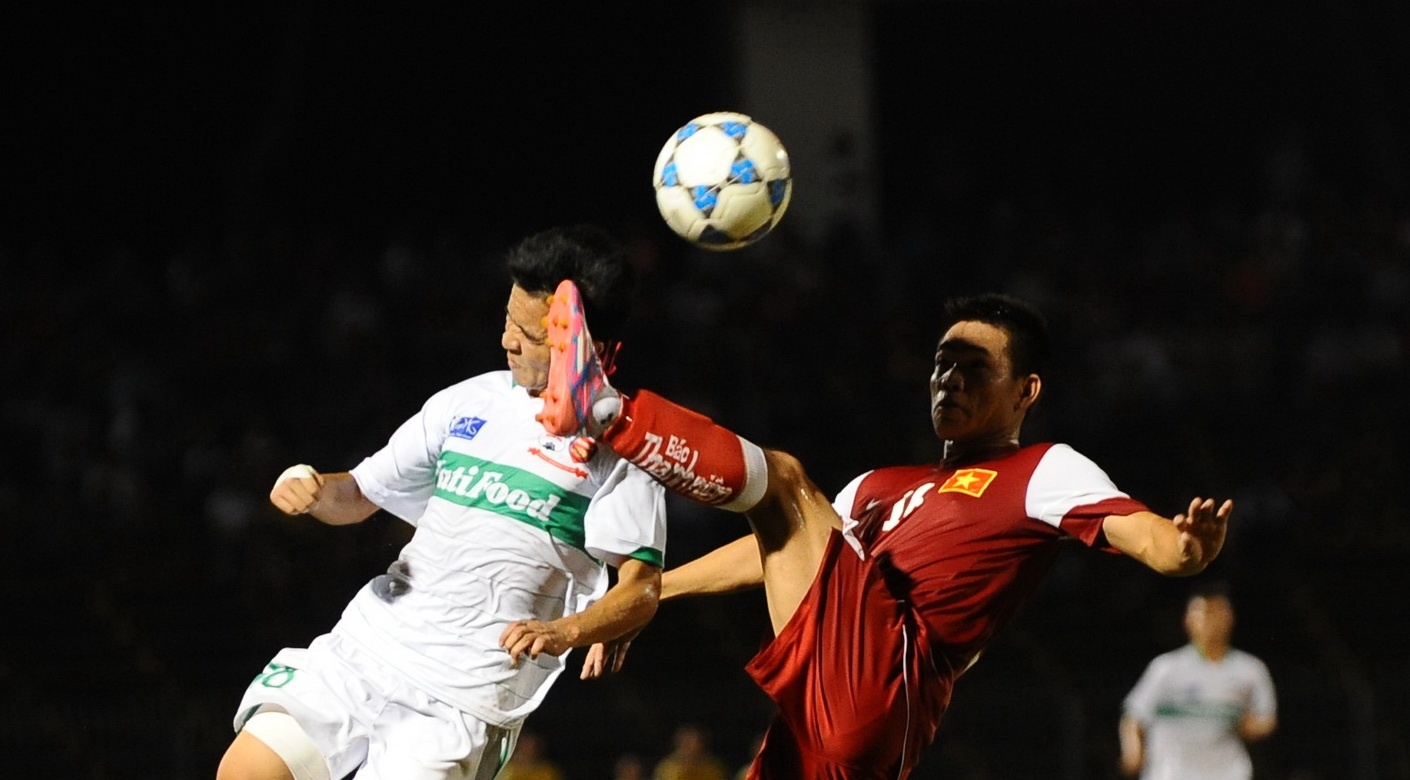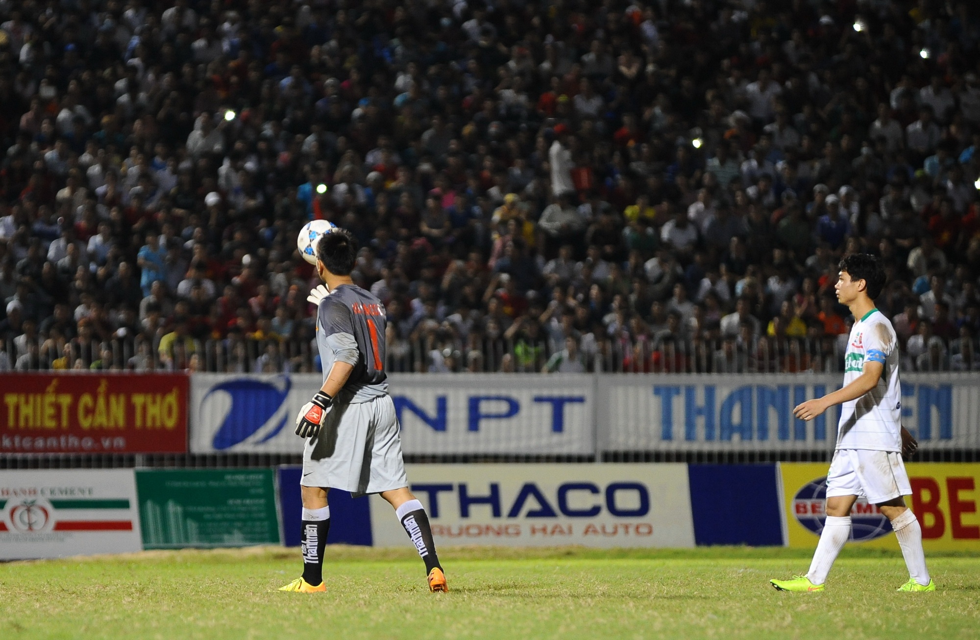 | Sau đó là liên tiếp những tình huống nằm sân câu giờ của thủ môn Văn Công mặc sự la ó của khán giả trên SVĐ Cần Thơ. |