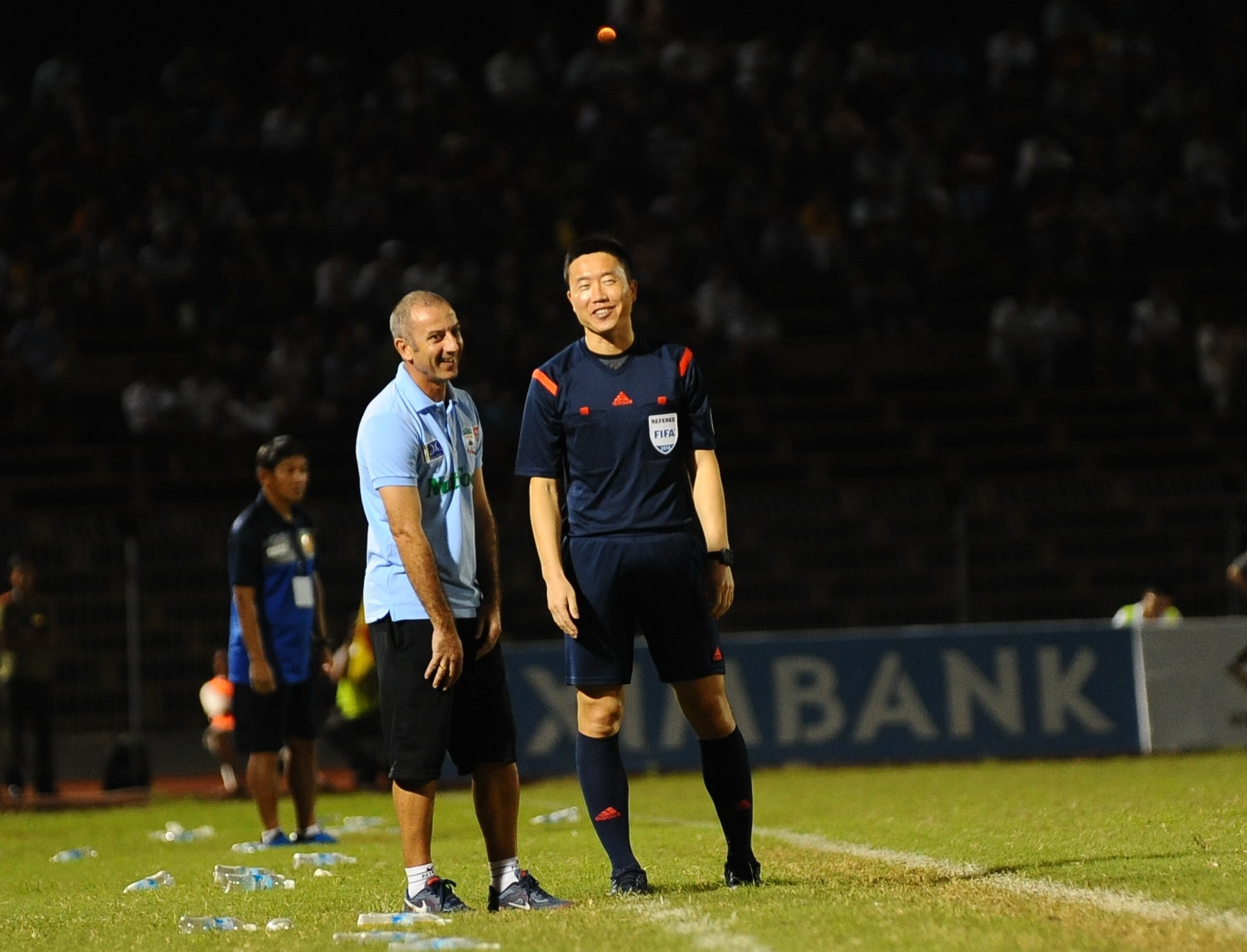 | HLV Graechen chỉ cười khi trao đổi với trọng tài về những hành vi thiếu fair-play của U21 Việt Nam. |