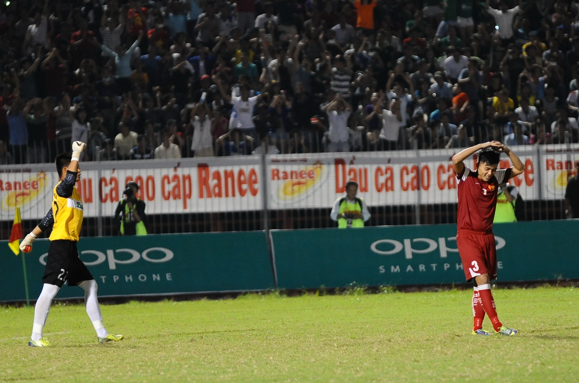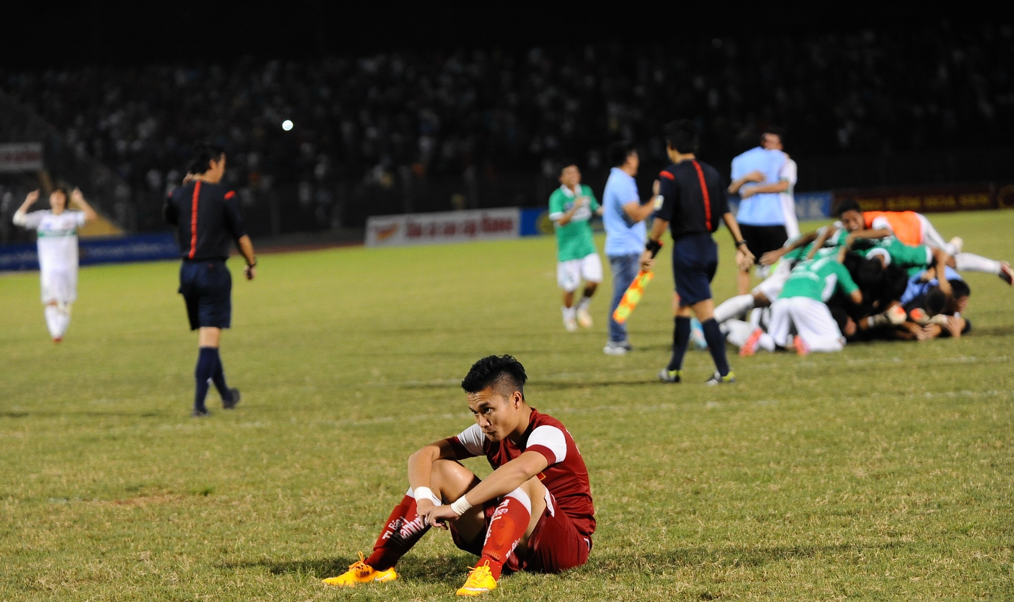| Nỗi buồn của Phi Sơn sau khi kết thúc trận đấu. Trong khi cầu thủ U19 HAGL hưởng niềm vui tột độ. |