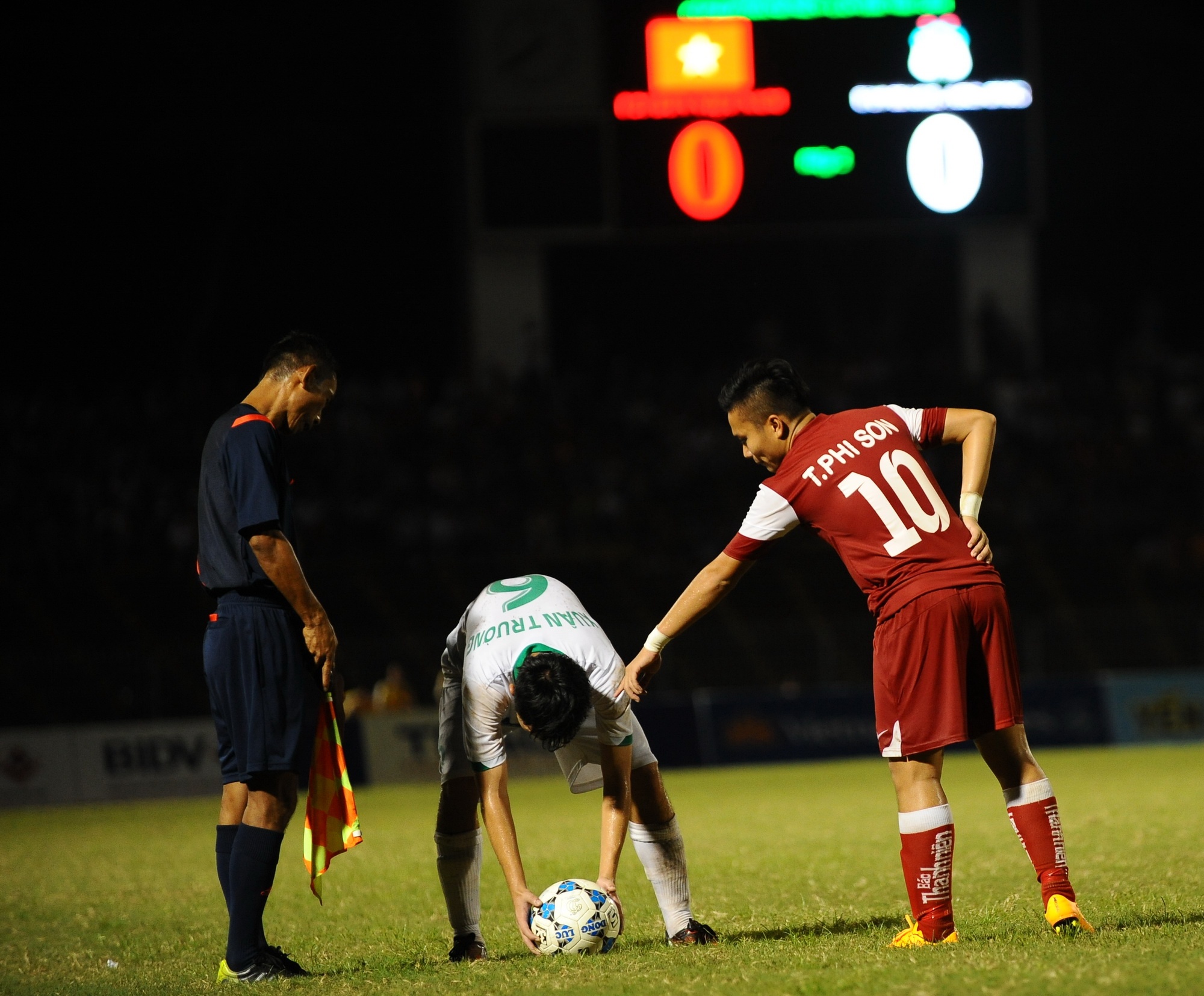 | Khi U19 HAGL được hưởng quả đá phạt từ khoảng cách hơn 30 m. Phi Sơn chạy tới phàn nàn với trọng tài về vị trí đặt bóng của Xuân Trường mặc dù vị trí hầu như không dịch chuyển nhiều so với điểm phạm lỗi. |