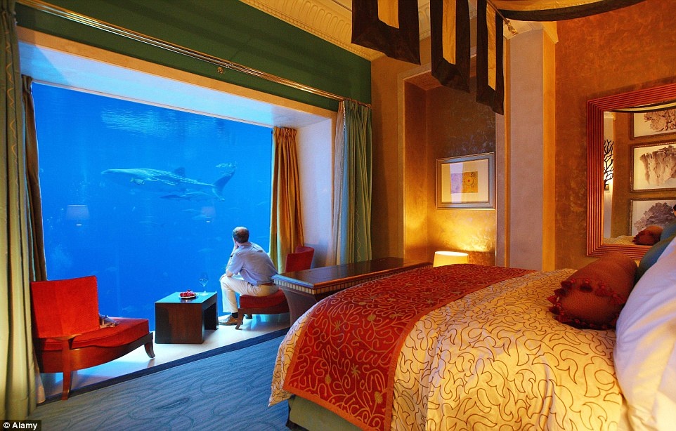 Căn phòng dưới nước, khu nghỉ dưỡng The Palm, Dubai, Các Tiểu vương quốc Ả Rập Thống nhất: Từ căn phòng sang trọng nằm dưới mặt nước, du khách sẽ có cơ hội quan sát cá mập và các sinh vật biển trong môi trường tự nhiên. Phòng khách sạn này đã tiếp đón nhiều người nổi tiếng, với giá một đêm lên tới 8.200 USD (tương đương 180 triệu đồng).