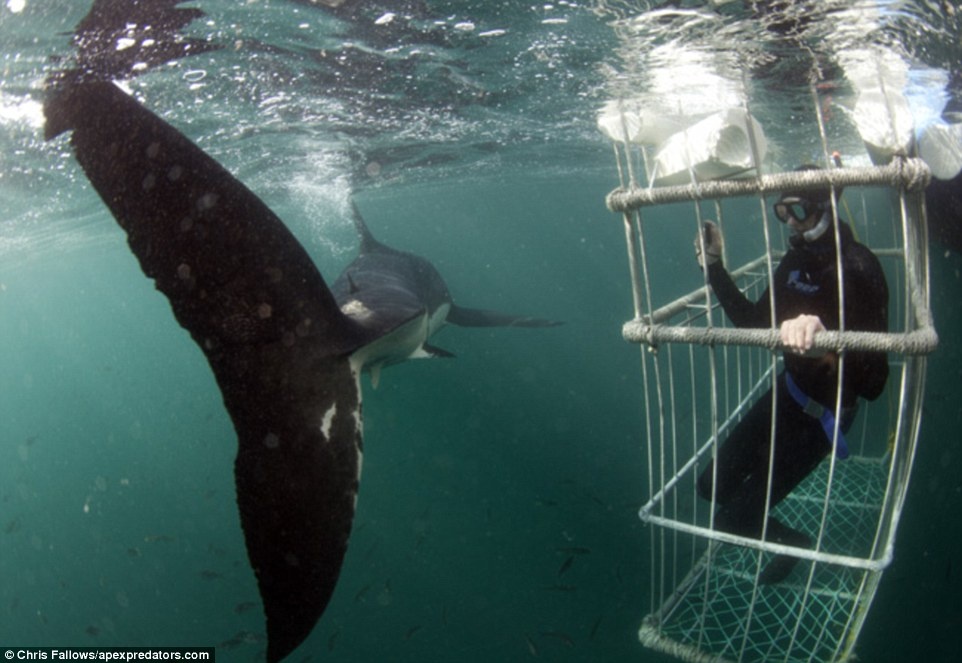 | Du khách sẽ vào một lồng sắt và được thả xuống lòng biển để quan sát những con cá mập khổng lồ. |