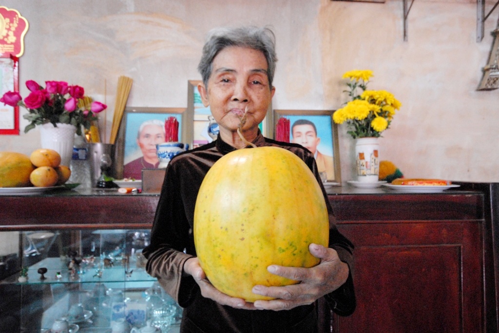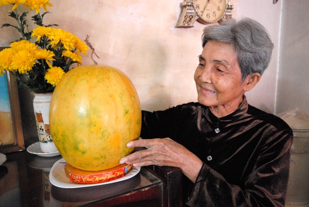 Bà Thoại kể, vào ngày 27 Tết Quý Tỵ (2013), bà ra chợ Thới Lai chọn mua cặp dưa hấu da vàng với giá 160.000 đồng/cặp, mỗi trái nặng 6,2 kg. |