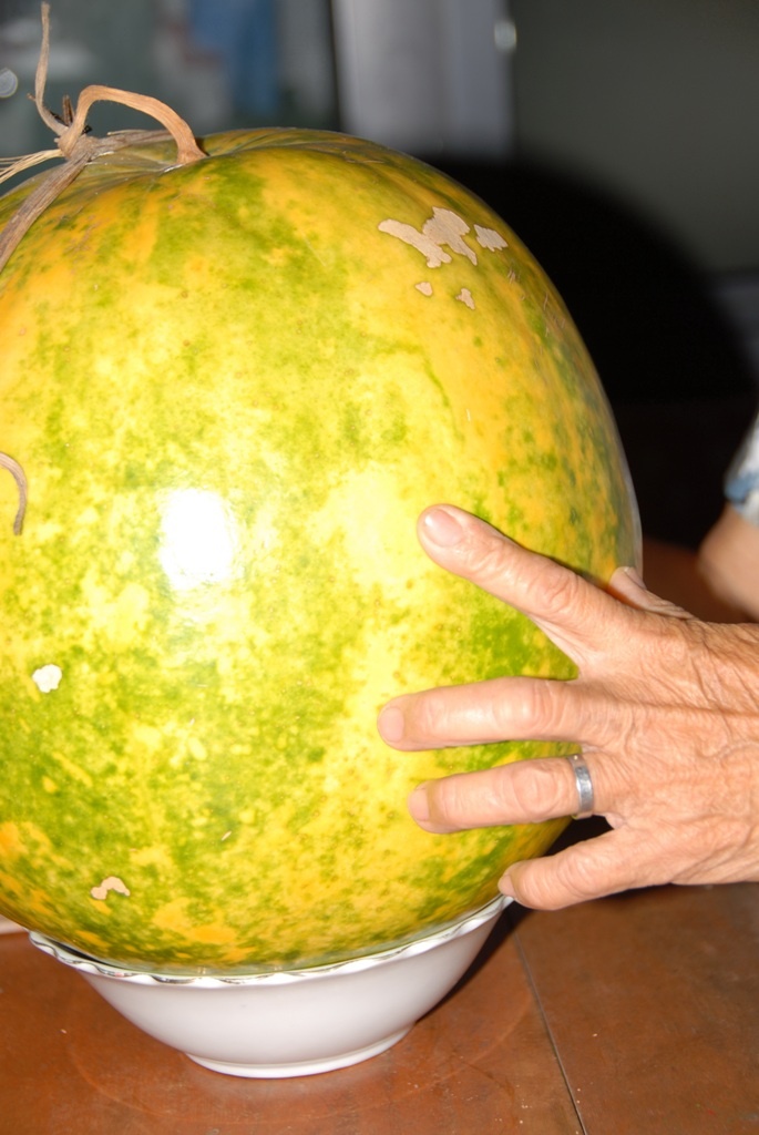 Theo lời anh Quới gia đình mua dưa về chưng vào 27 tết năm 2013, nhưng đến nay vẫn chưa có biểu hiện hư thối mà thậm chí còn có dấu hiệu phát triển thêm cả về cân nặng lẫn hình dáng và màu sắc. |