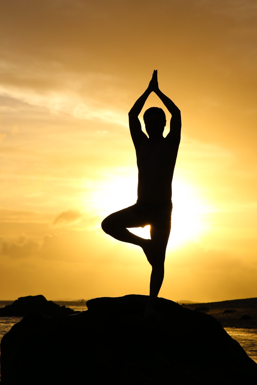 | Tập yoga trên bãi biển trong ánh hoàng hôn. |
