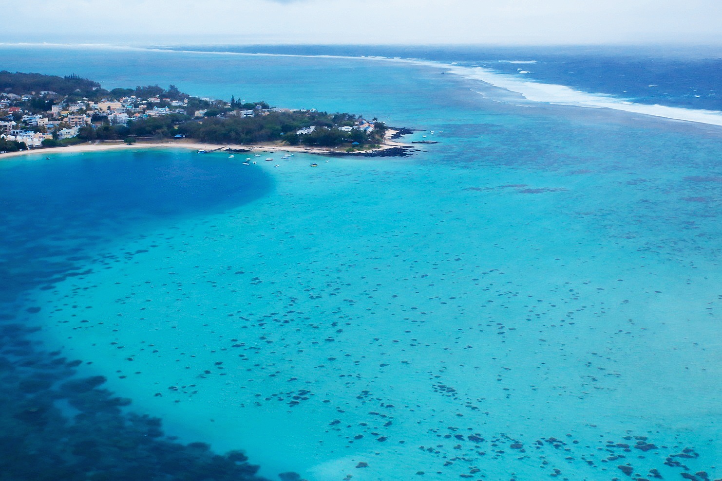 | Nằm giữa Ấn Độ Dương, Mauritius sở hữu một thềm san hô bao trọn vẹn quanh đảo. Hình ảnh được chụp từ trực thăng. |