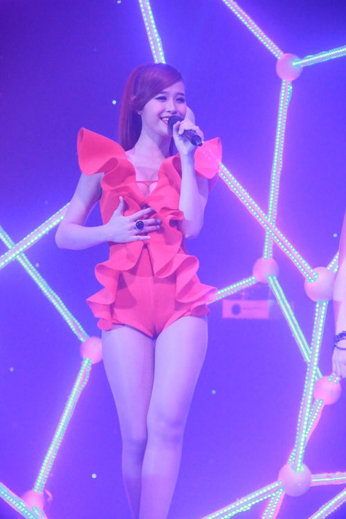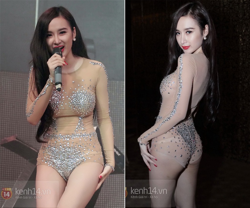 | Tối 22/8, Angela Phương Trinh biểu diễn với bộ bodysuit màu nude may bằng chất vải mỏng, có đính đá ở những bộ phận nhạy cảm. Bộ trang phục siêu ngắn, khoe toàn bộ cặp chân trần nuột nà của cô. Dưới ánh đèn sáng bình thường, chúng ta còn có thể nhìn rõ mồn một nội y đằng sau lớp vải mỏng mà có cũng như không của cô. |