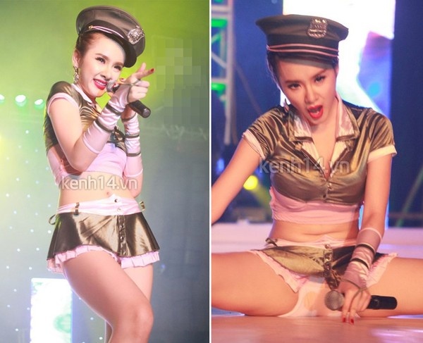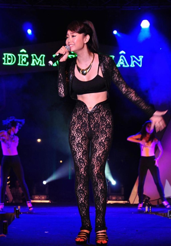 | Một sao nữ khác vốn được nhớ đến với những trang phục kín đáo nhưng vẫn quyến rũ là Phương Linh. Thế nhưng, khi trình diễn trên một chương trình truyền hình, cô diện trang phục xuyên thấu lộ liễu đến quá đáng. Chúng ta còn nhìn rõ được 2 miếng mút ngực đằng sau lớp vải có cũng như không mà cô mặc. |
