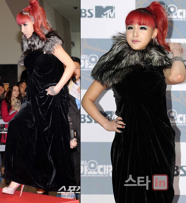 | Với chiếc váy nhung đen dài dáng suôn, kín mít từ trên xuống dưới và phần lông phủ kín cổ, Park Bom (2NE1) trông như một bà bầu nặng nề và khiến người khác có cảm giác khó thở. |