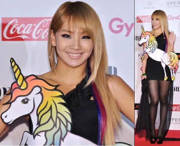 | Một thiết kế khác của Jeremy Scott khiến CL của 2NE1 như mang theo đồ chơi là thú nhồi bông đến tham dự lễ trao giải SBS Gayo Daejun 2011. |
