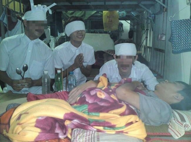 | Một nhóm sinh viên thích thú khi làm đám tang giả cho bạn. Ảnh: F.K. |