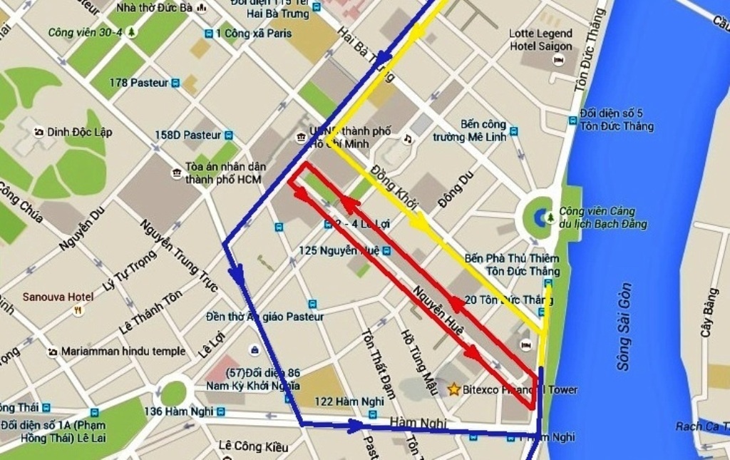 | Phố đi bộ Nguyễn Huệ (màu đỏ) cấm tất cả các loại xe từ 7h đến 23h ngày 2/9 và lộ trình thay thế. |