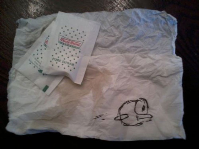 Bức tranh vẽ trên tấm giấy ăn nhặt trong thùng rác của nhà hàng Krispy Kreme này được quảng cáo "còn sạch sẽ, nguyên vẹn, là kiệt tác và sản phẩm cần có với bất cứ nhà sưu tập Flappy Bird nào". Vì những lý do trên, để có thể mua được tác phẩm này mà không phải chờ đấu giá, bạn cần chuẩn bị số tiền khoảng 2,1 tỷ đồng. 2 gói đường là quà tặng kèm cho người mua.