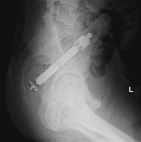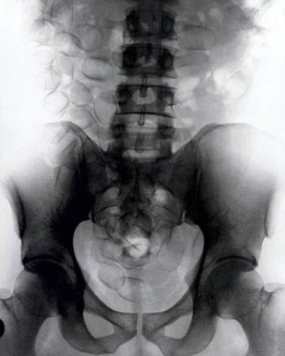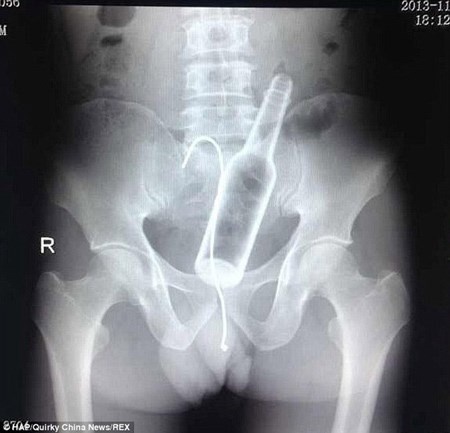 | Các bức hình chụp X-quang cho thấy cả một chai nước nằm hoàn toàn trong hậu môn của bệnh nhân này. Ông cho biết, trước đó đã mắc chứng táo bón trong một thời gian dài nhưng không làm sao chữa khỏi. Vì vậy, ông quyết định làm liều bằng cách lấy chai nước đưa vào hậu môn để “kích thích”. |