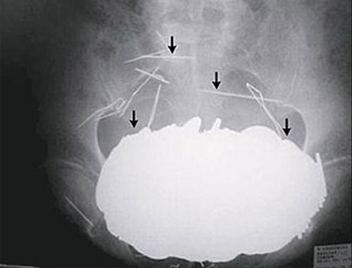 | Vào năm 2002, một người đàn ông 62 tuổi đến từ Pháp đã nuốt 350 đồng xu vào bụng để thay đổi chế độ ăn uống. Ngay sau đó, ông đã lập tức được đưa đến bệnh viện. Các bác sỹ đã phát hiện một khối tiền xu nặng 5,5kg, trông hệt như một quả bóng bowling. |