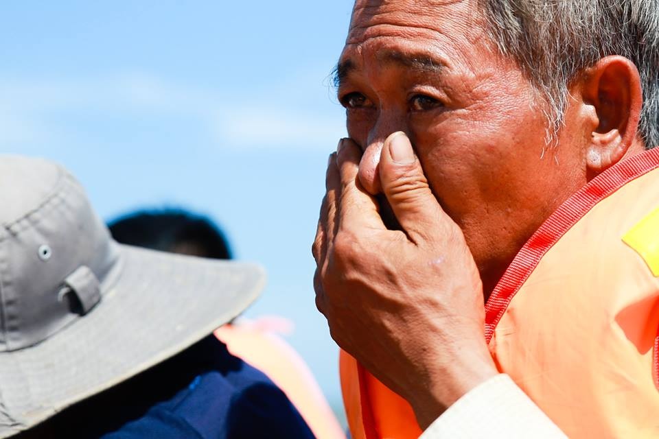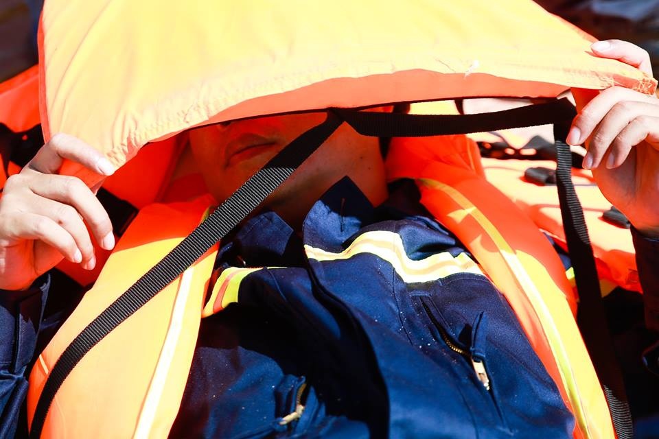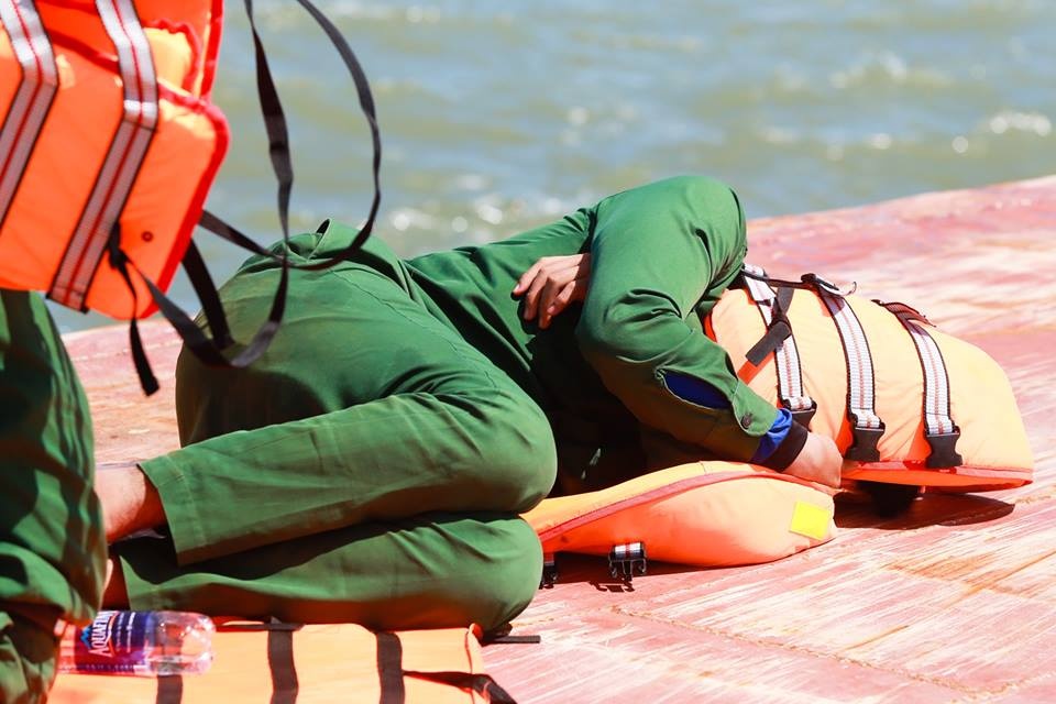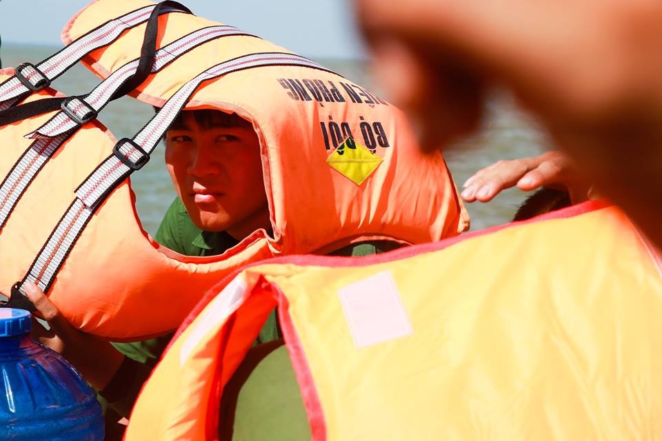 | Giữa biển trời rất nắng, nên các chiến sĩ cứu hộ dùng áo phao che lên đầu. |