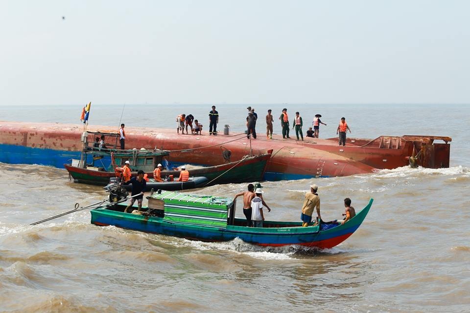 Nhận được tin tàu hàng chìm ở luồng Soài Rạp, nhà chức trách TP HCM cử hơn 100 chiến sĩ cùng với ngư dân lập tức đến hiện trường tham gia cứu nạn.