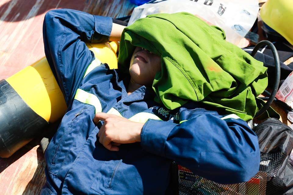 | Vì quá mệt nên nhiều chiến sĩ tranh thủ chợp mắt đôi phút, sau đó lại tiến hành công việc. |