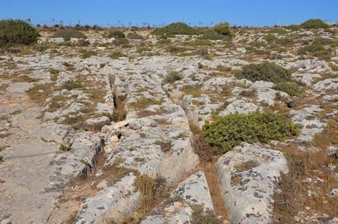 Một mạng lưới phức tạp những đường rãnh song song cắt sâu vào bề mặt đá vôi rải rác khắp nơi mà dường như do con người tạo ra. Người dân địa phương gọi chúng là "những vết bánh xe" do chúng chẳng khác gì dấu bánh xe để lại.Những đường rãnh này chỗ sâu nhất đến 60 cm, khoảng cách trung bình giữa hai đường song song ổn định trong khoảng 110-140 cm. Chúng cũng cắt ngang nhau ở nhiều nơi, trong khi một số nơi khác lại chia ra làm nhiều nhánh nhỏ...