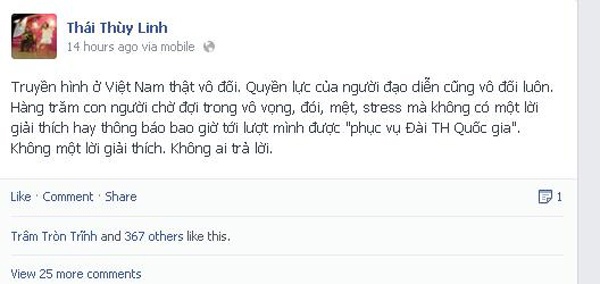 | “Hàng trăm con người chờ đợi trong vô vọng, đói, mệt, stress mà không có một lời giải thích hay thông báo bao giờ tới lượt mình được ‘phục vụ Đài TH Quốc gia’. Không một lời giải thích. Không ai trả lời” – nữ ca sĩ viết. |