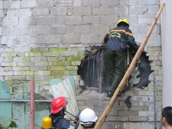 | Cảnh sát PCCC phải đục tường để tiếp cận đám cháy tại vũ trường New Phương Đông. |