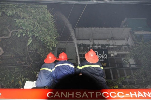 | Cảnh sát PCCC Hà Nội đang cố gắng dập tắt ngọn lửa bùng lên rất mạnh tại quán bar trên phố Mã Mây. |