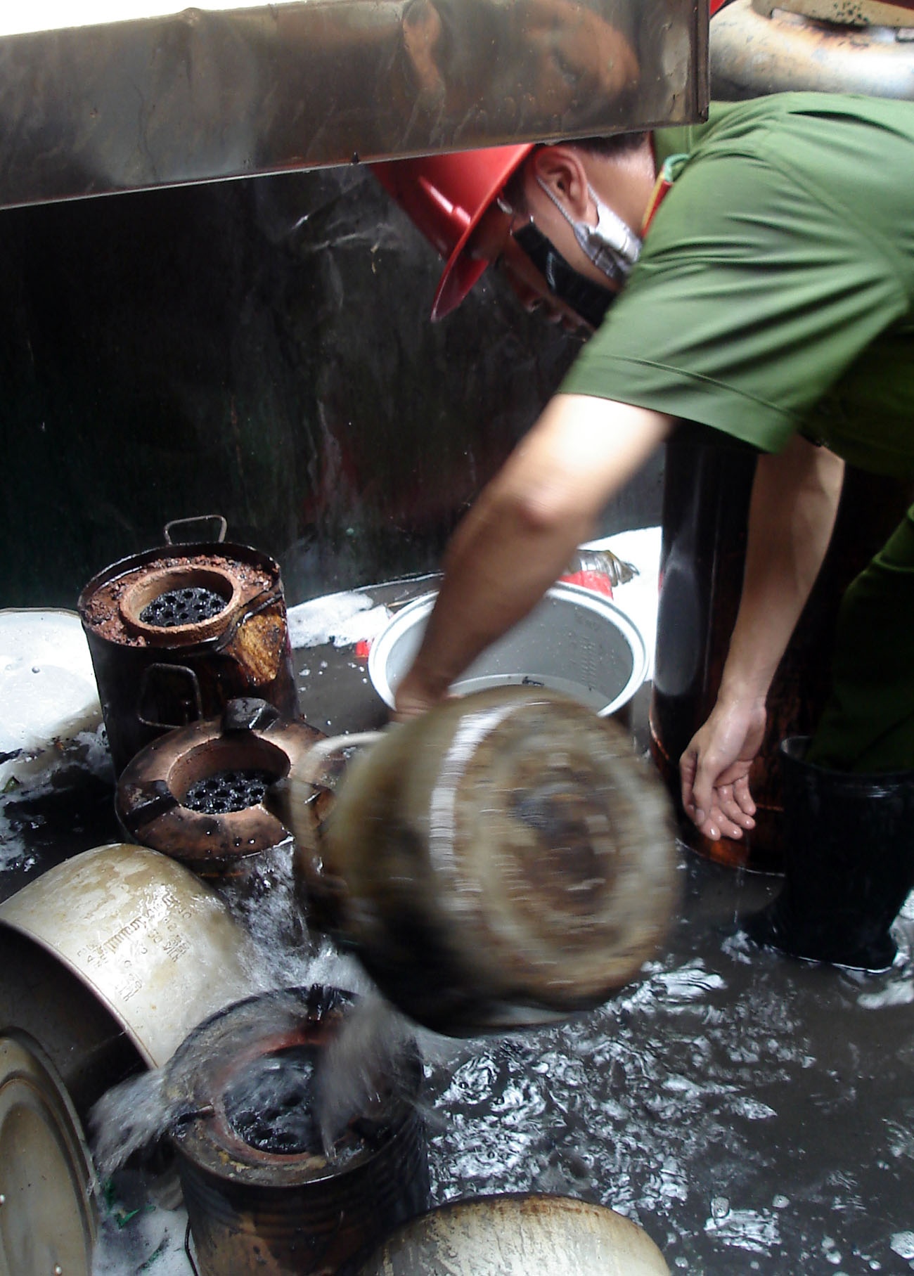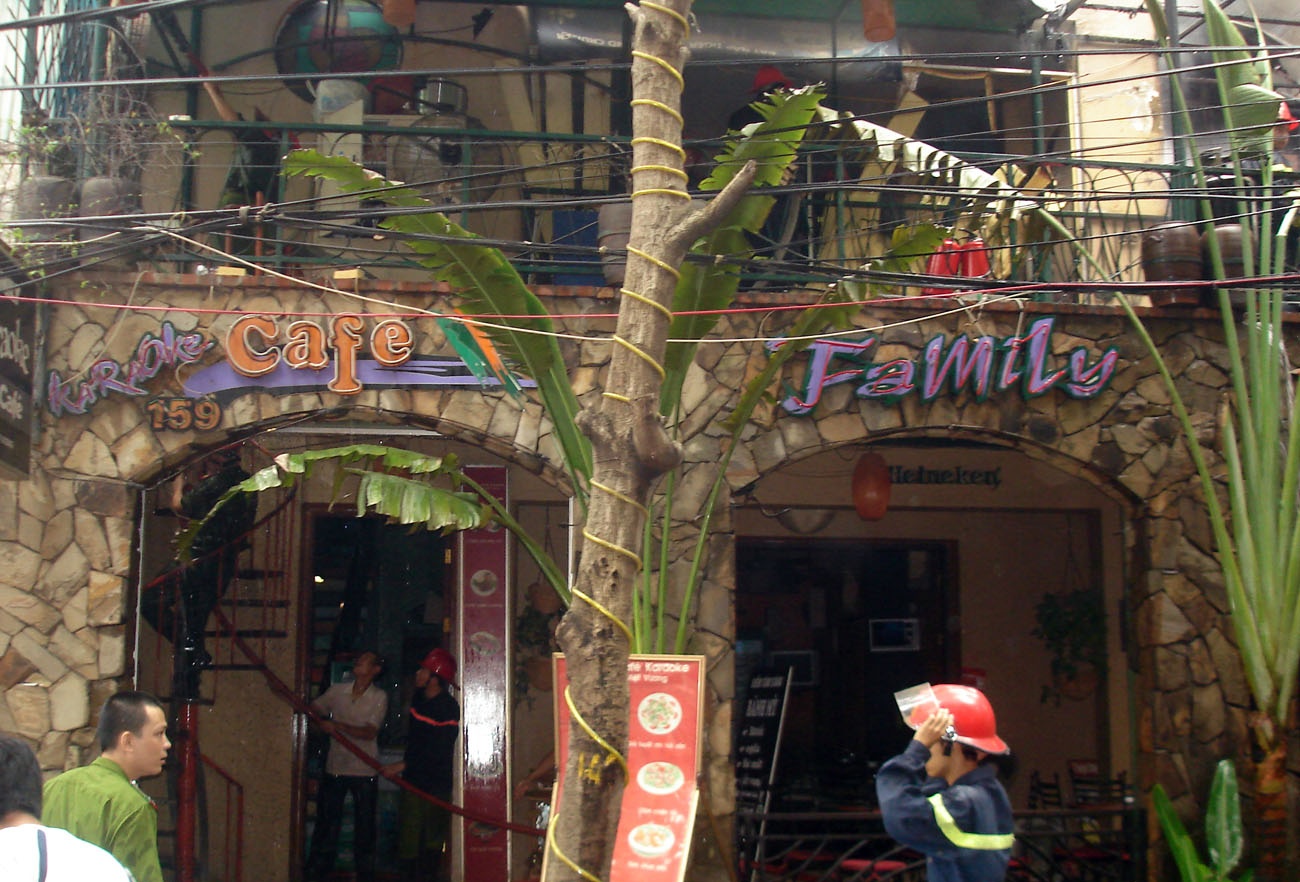 Tháng 6/2009 khu bếp tầng 2 quán cafe - karaoke trên phố Triệu Việt Vương (quận Hoàn Kiếm, Hà Nội) cũng gặp cháy. Khu bếp của quán được đặt ngoài trời, cạnh lối đi là 6 bình gas loại 45kg/bình. Để sát các bình gas là 3 bếp than tổ ong đang rực lửa. Ảnh: Việt Đức.