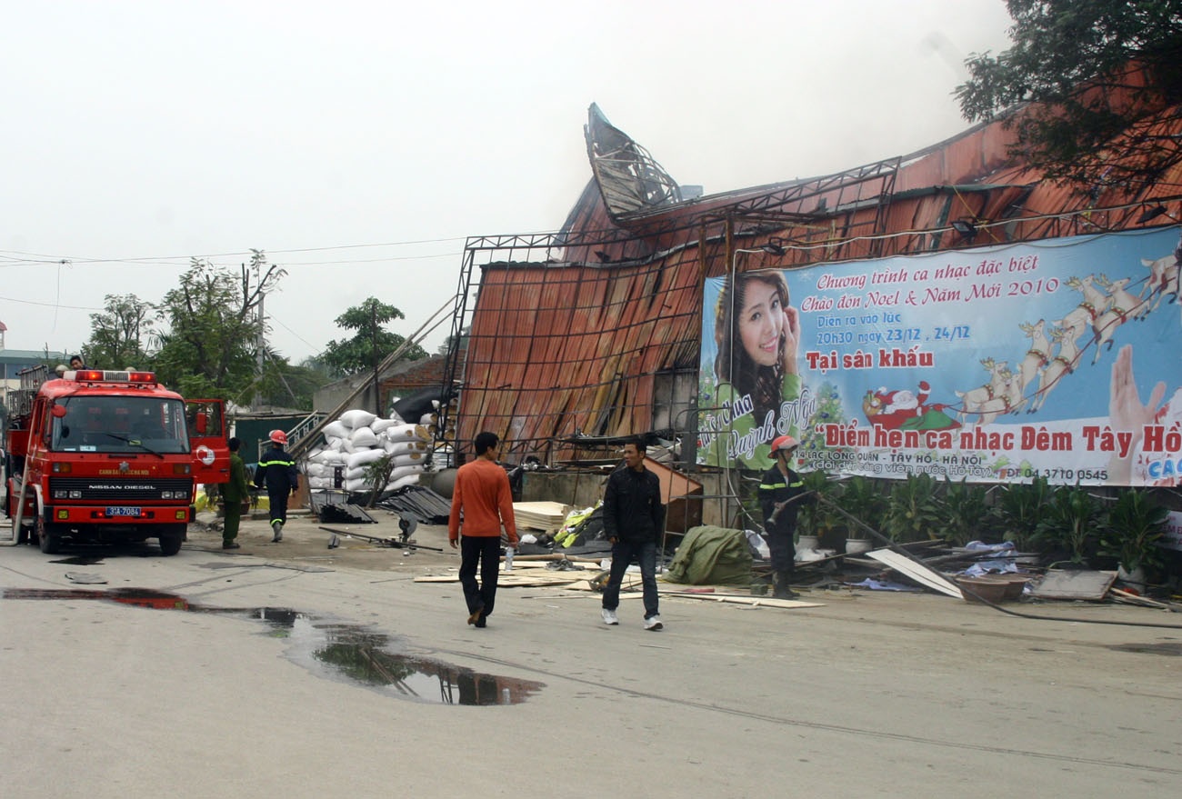 Tháng 1/2010, cháy xảy ra tại nhà hàng Điểm hẹn ca nhạc đêm Tây Hồ, ngõ 614 Lạc Long Quân (quận Tây Hồ, Hà Nội). Đám cháy bùng phát dữ dội trong gần một giờ đồng hồ khiến một người chết, một người bị thương, thiêu rụi khoảng 560m2 nhà hàng. Ảnh: Việt Đức.