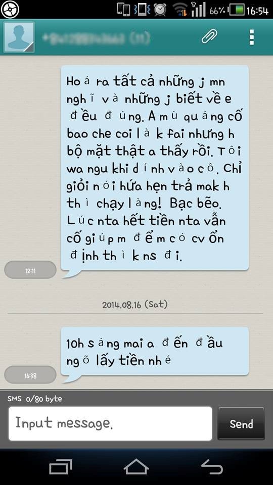 Đi kèm với bài viết vạch trần bạn trai cũ, M.M đính kèm thêm hình ảnh chụp lại tin nhắn của bạn trai. Nội dung đoạn tin nhắn: H. à, anh T. đây. Em ơi đợt này anh có việc, hơi thiếu thốn. Mà hồi trước em còn vay anh 700.000 đồng ấy. Sang tuần em cho anh xin lại được không? Em cứ qua nhà hoặc gặp anh ở trường đều được. Cảm ơn em".