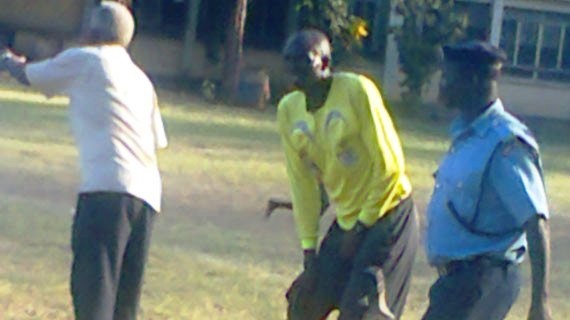 | Trọng tài Wamalwa đau đớn sau khi bị tấn công mạnh vào "vùng kín". Ành: Ghanasoccer. |