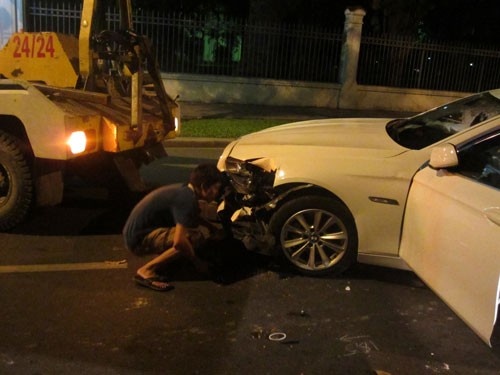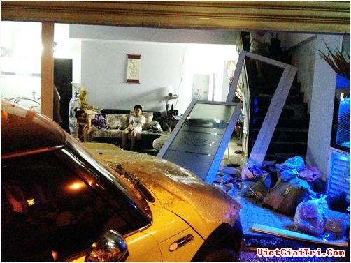 | Nguyên Vũ gặp tai nạn khi cầm lái chiếc Mini Cooper chở Triệu Tú Trâm chạy show. Hiện trường vụ tai nạn khiến không ít người hoảng sợ, lo lắng. May mắn là không ai bị thương. |