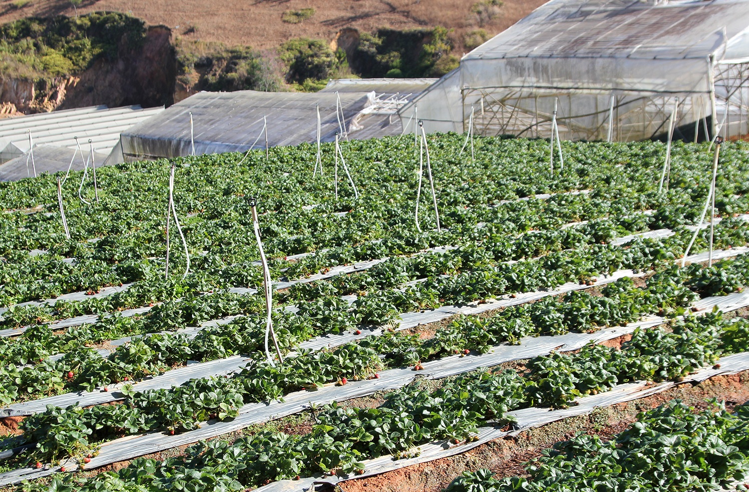 | Những luống dâu tây xanh mướt. Ở Đà Lạt, một nhà vườn thường trồng nhiều loại dâu, để đáp ứng nhu cầu đa dạng của thị trường. |