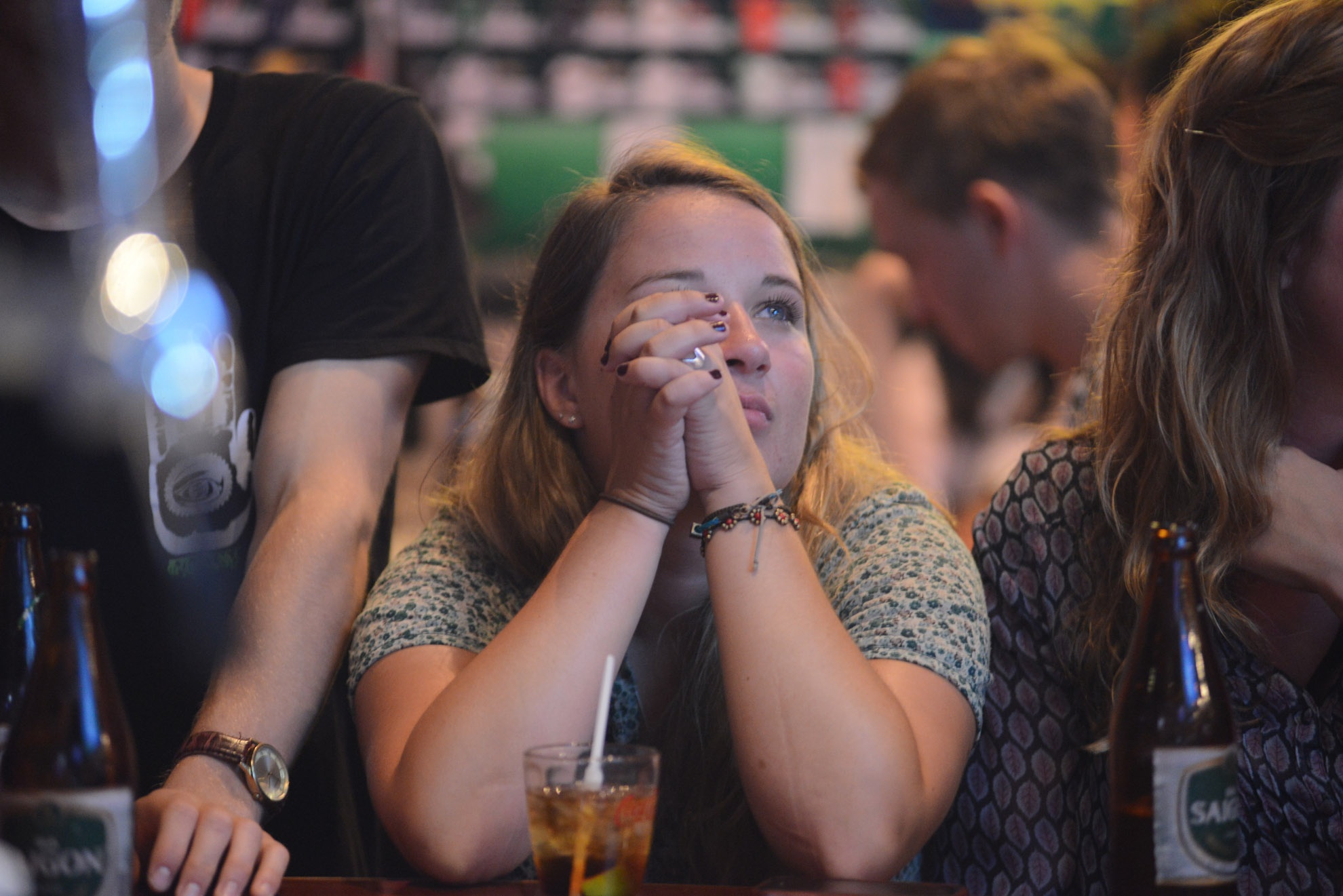 | Một cổ động viên nữ mệt mỏi khi trận đấu bất phân thắng bại. |