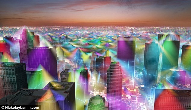 Nghệ sĩ Nickolay Lamm mở ra cái nhìn hoàn toàn mới về thành phố New York và Chicago bằng cách nhuộm màu các loại sóng di động trong thành phố. Lamm đã làm việc với các chuyên gia kỹ thuộc máy tính ở Illinois nhằm xác định các mạng di động và tần số của chúng. |
