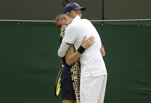 | Nhưng Kyrgios cũng không thể tạo nên cuộc lội ngược dòng trước đàn anh người Pháp. Tay vợt 20 tuổi ôm chầm lấy một cậu bé nhặt bóng sau thất bại. |