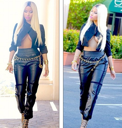 Ngày hôm qua, khi tham dự một talkshow, Nicki Minaj đã mặc một trang phục cực kỳ "đốt mắt". Đó là chiếc quần giúp Nicki khoe được vòng 3 "khủng" chẳng kém gì Kim Kardashian. Kết hợp với đó là chiếc áo dạng lửng chỉ cài một cúc trên cùng có phần hơi chật chội so với thân hình nở nang của Nicki.