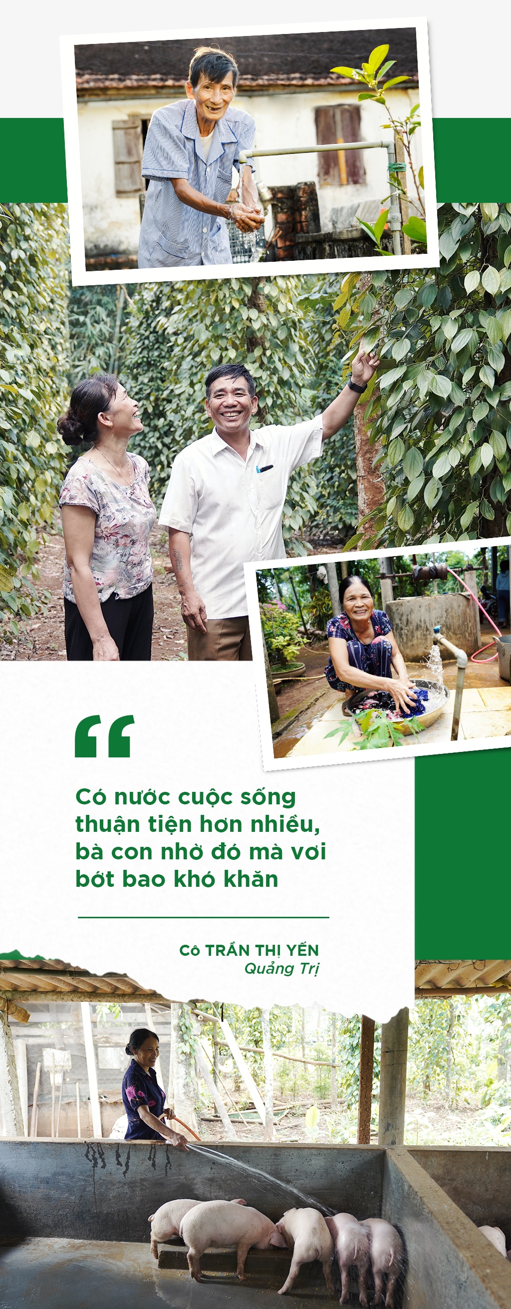 Giữa cái nắng gắt của miền Trung, trong ánh mắt cô Trần Thị Yến (thôn Nghĩa Phong, xã Cam Nghĩa, huyện Cam Lộ, tỉnh Quảng Trị) phản chiếu một màu xanh biếc của cây cối và hy vọng. Mảnh đất cằn cỗi ngày nào dần chuyển sang sắc xanh của những luống rau mơn mởn, căng đầy sức sống. Những trụ tiêu vươn mình xanh tốt, trĩu quả khắp cành. Chuồng trại đầy gia cầm, gia súc; đàn lợn nhờ được chăm bẵm, tắm rửa kỹ lưỡng nên ngày càng mập mạp, béo tốt.