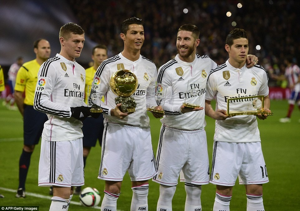 | Những ngôi sao sáng nhất của Real năm 2014 hào hứng khoe các danh hiệu cá nhân cao quý trước hàng vạn Madridista trước khi bước vào cuộc đại chiến với kình địch cùng thành phố Madrid. |