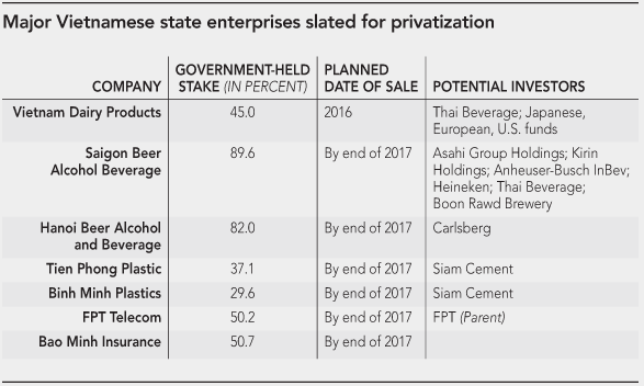 Việt Nam có khoảng 800 doanh nghiệp thuộc sở hữu của nhà nước vào cuối năm 2015. Chính phủ thoái vốn khoảng 60 công ty trong số đó từ tháng 1 đến tháng 5, thu về hơn 233 triệu USD. Tuy nhiên, 12 công ty trong kế hoạch mới nhất sẽ là những doanh nghiệp đầu tiên trong số những doanh nghiệp cốt lõi của nhà nước được tư nhân hoá toàn phần.