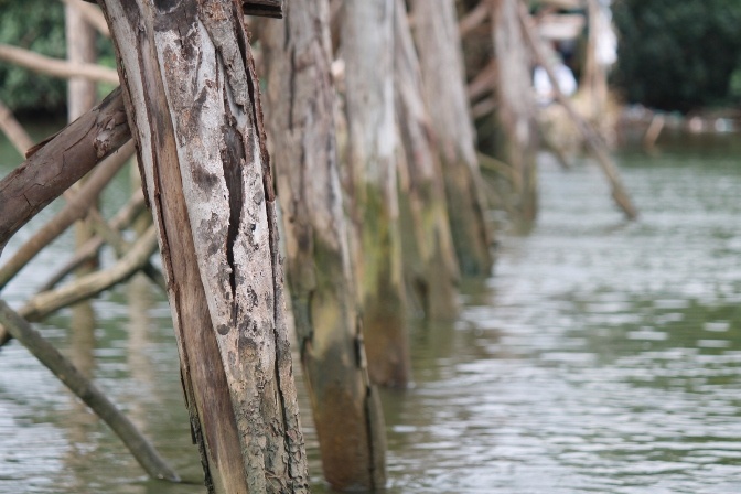 | Nó cũ kỹ, ọp ẹp, xộc xệch và yếu đến nỗi một nửa chiếc cầu nằm chìm dưới mặt nước. |